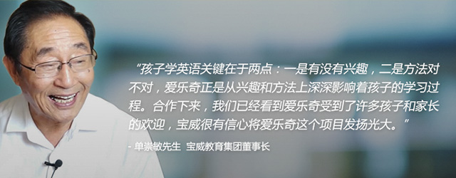 董事长单崇敏先生在教育方面一直有着自己独到的看法和远见。单先生认为,在宝威的战略布局中,拥抱互联网是历史的必然。从这个方面来讲,爱乐奇是先走了一步。他同时表示宝威很有信心和爱乐奇的合作项目将来一定会在宝威发扬光大。爱乐奇为宝威和社会提供这样好的产品,他对爱乐奇的员工和 表达了深深的祝愿和感激之情。
