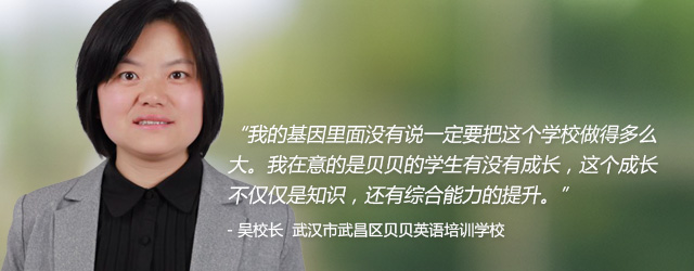 “我大学读的是师范大学,一毕业就分配到当地的高中教书,后来辞职创业。其实起初的想法就是实现自己的梦想——我要按照自己的思想体系来创办一个学校。”贝贝英语吴校长现在回忆起十二年的创业历程时更多的是一种从容和淡然,但其中的艰辛和不易只有她自己知道。