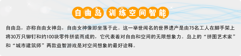 自由岛,亦称自由女神岛,自由女神像即坐落于此。这一举世闻名的世界遗产是由75名工人在脚手架上将30万只铆钉和约100块零件拼装而成的,它代表着对自由和空间的无限想象力。岛上的“拼图艺术家”和“城市建筑师”两款益智游戏是对空间想象的最好诠释。