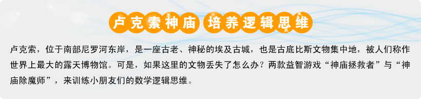 卢克索,位于南部尼罗河东岸,是一座古老、神秘的埃及古城,也是古底比斯文物集中地,被人们称作世界上最大的露天博物馆。可是,如果这里的文物丢失了怎么办?两款益智游戏“神庙拯救者”与“神庙除魔师”,来训练小朋友们的数学逻辑思维。